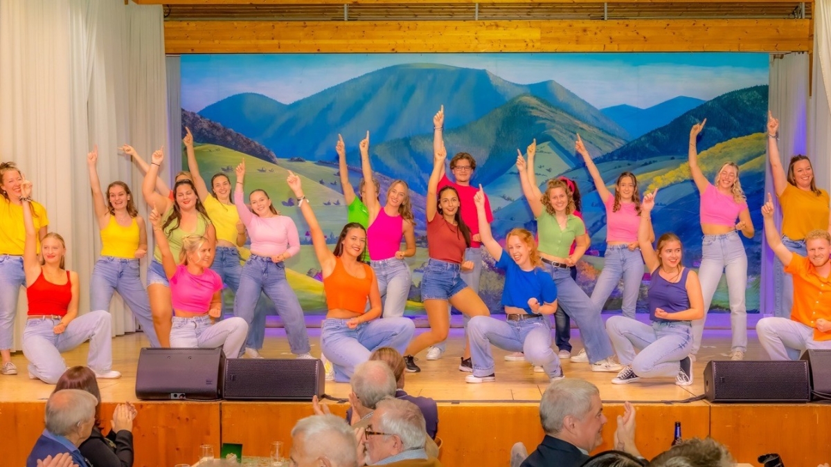 Nachdem die Grußworte gesprochen waren, trat mit Jan Pfefferle der Moderator des Abends auf die Bühne. In gewohnt humorvoller und souveräner Art führte er durch das ansprechende und kurzweilige Programm. Den Anfang machten die Dance Kids, die eine äußerst gelungene Darbietung auf die Bühne zauberten. Im Anschluss daran gab Arno Herbener mit seinen Gästen einen launigen Beitrag zur Historie der Sportvereinigung. Hierzu hatte er Zeitzeugen zu einem Gesprächskreis eingeladen. Souverän führte er durch diese Runde, die mit Bildern aus den unterschiedlichen Epochen garniert wurde. Namentlich auf der Bühne waren: Theodor Gutmann, der älteste der Teilnehmer mit 94 Jahren, Bruno Bäuerle, Roland Riesterer, Emil und Oskar Burgert, Peter Dietsche und Frank Schneider, die zu den gezeigten Bildern die entsprechenden Kommentare abgaben. Beendet wurde dieser Vortrag mit der Vereinshymne „Grün und Weiß wie lieb ich dich“, die von der Gruppe um Arno Herbener angestimmt wurde und in die das gesamten Publikum stehend mit einstimmte. Ein durchaus ergreifender Moment an diesem Abend.